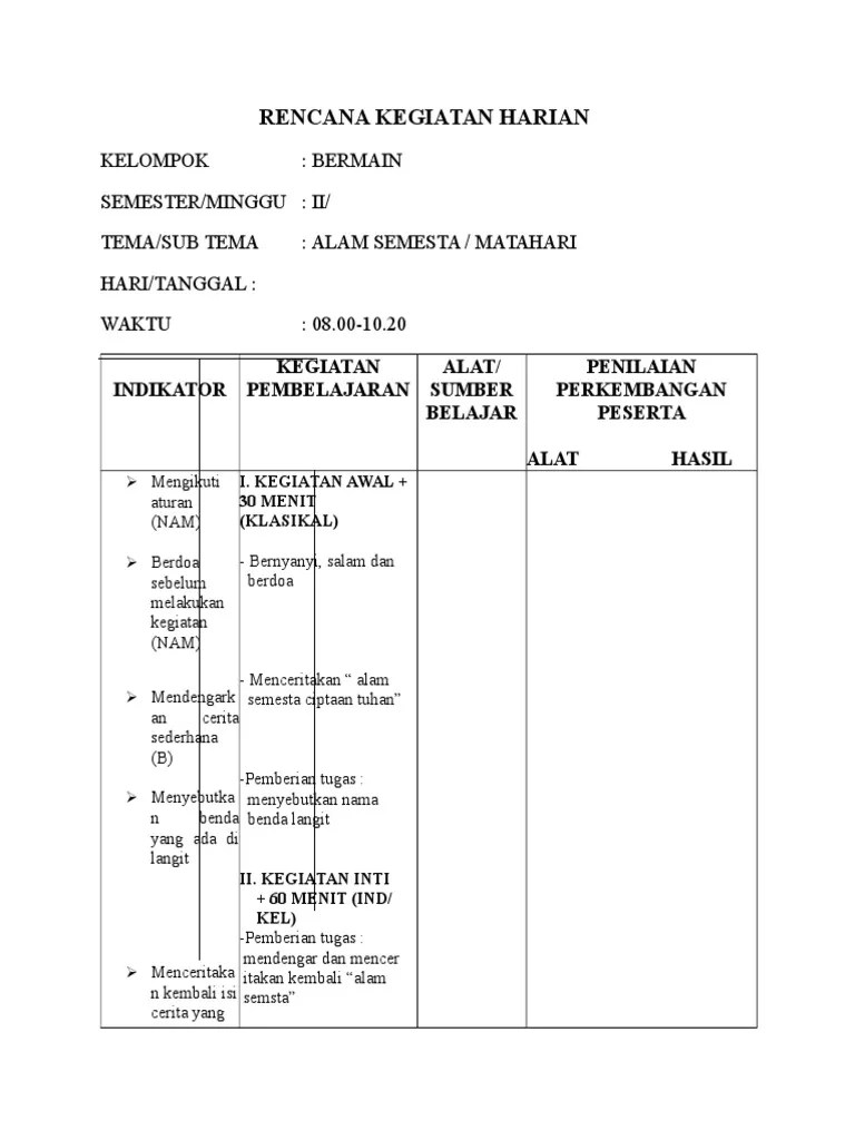 Nama baru untuk rkh (rentjana kegiatan harian) adalah rpph (rencana pelaksanaan . Rencana kegiatan harian (rkh) model pembelajaran paud teacher . Rkh dan rkm (contoh)full description. 85 downloads 303 views 203kb size. Angket yang dibuat ditjukan untuk guru paud.dalam penelitian ini arsip atau dokumen yang digunakan adalah berupa rencana kegiatan harian.